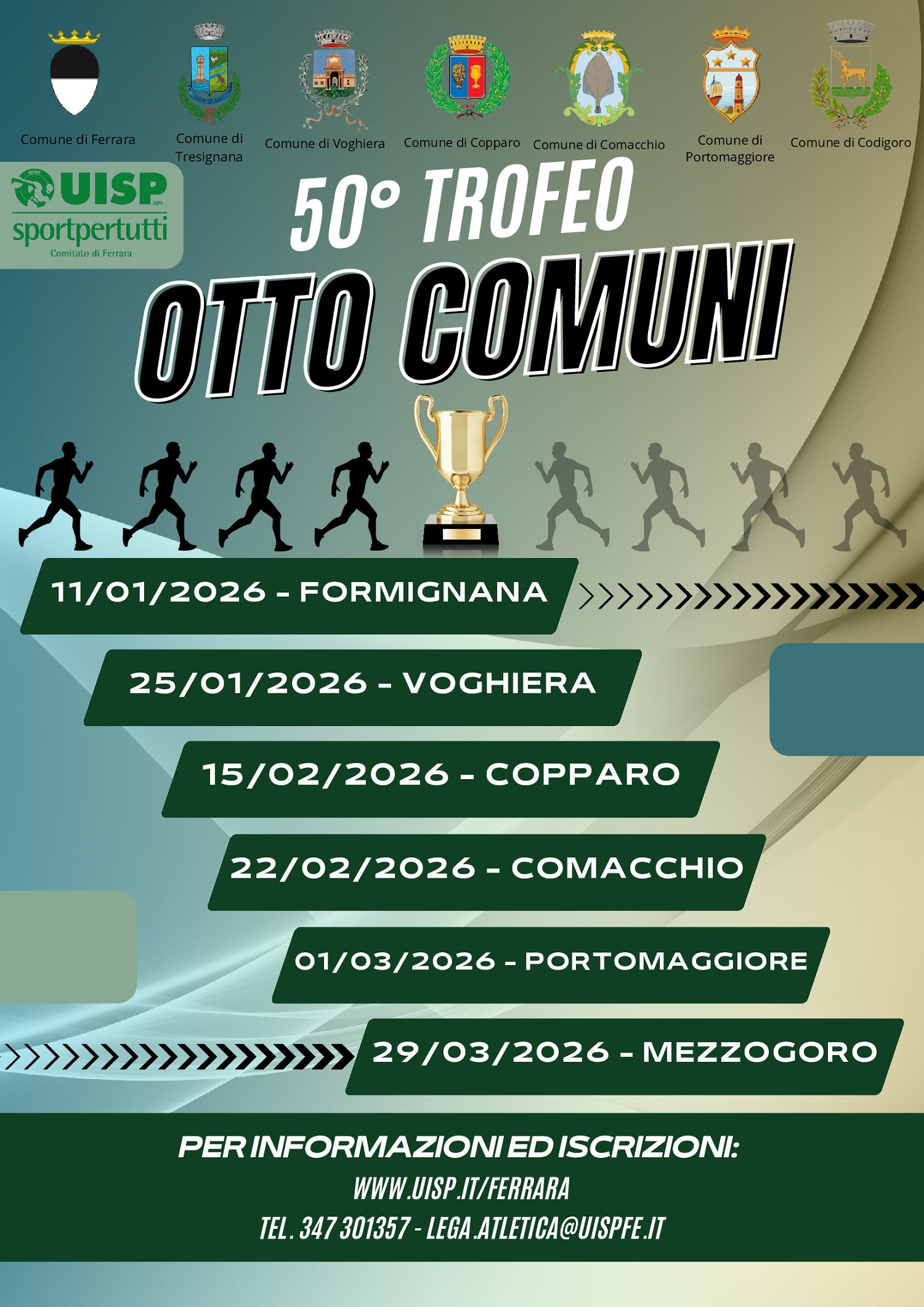 Il calendario completo del Trofeo ‘Otto Comuni’ inizierà nel mese di gennaio con due tappe l’11 a Formignana, e il 25 a Voghiera; a febbraio, si correrà il 15 a Copparo e il 22 a Comacchio; a marzo sono previste le ultime due tappe, il giorno 1 a Portomaggiore e il 29, con premiazioni finali, a Mezzogoro.