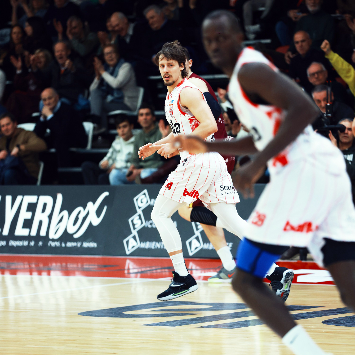 Nel secondo quarto due triple di Montano valgono il massimo vantaggio sul 33-13. La Libertas prova a rientrare costruendo un parziale di 4-10 trascinata da Possamai, autentica spina nel fianco nel pitturato biancorosso. Nel finale di tempo una tripla di Tanfoglio e uno sfondamento subito dallo stesso esterno ricacciano Livorno a -17. Si va all’intervallo sul 47-30.