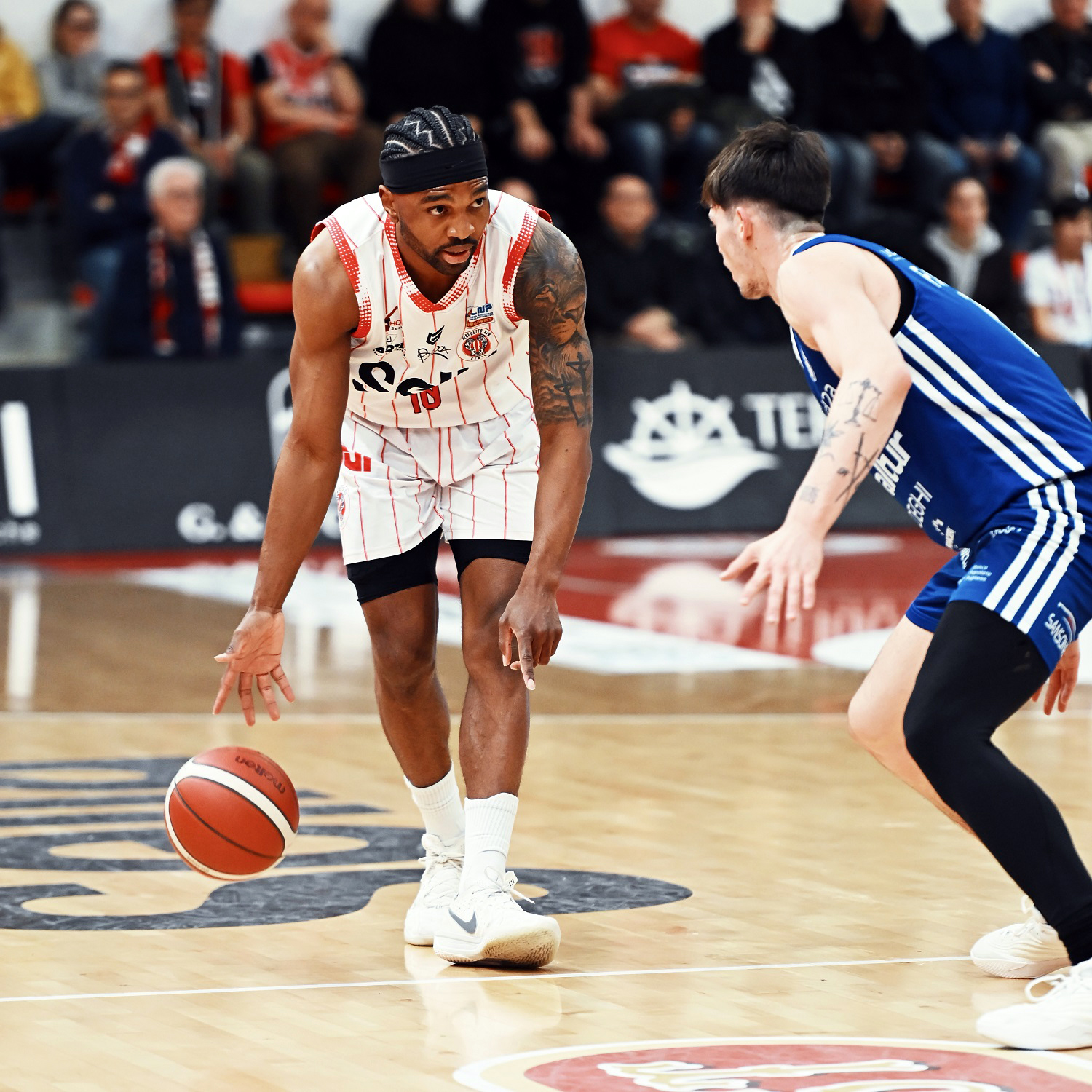 Coach Di Paolantonio, per iniziare il match, si affida a: Berdini, Conti, Devoe, Davis e Fall. Coach Bucchi risponde con Copeland, Cinciarini, Vildera, Esposito e Fantoma. Prima dell’inizio del match, il Presidente Gianni Fava consegna a Massimiliano Moretti il premio come miglior Under 21 Adidas per il mese di febbraio in Serie A2.