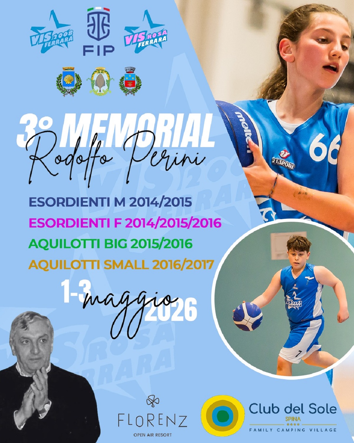 Presentata nella mattinata di lunedì al ‘Florenz Open Air Resort’ di Lido degli Scacchi la terza edizione del “Memorial Rodolfo Perini” realizzato nel ricordo del grande protagonista della pallacanestro ferrarese, che fu allenatore in Serie A delle squadre maschili di Forlì e Fortitudo e della squadra femminile di Ferrara. Il torneo di minibasket in programma dall’1 al 3 maggio prossimi a Comacchio, Lagosanto e Ostellato, vedrà trentadue squadre, arrivate da tutta Italia, sfidarsi su quattro campi, divise nelle categorie Aquilotti Small, Aquilotti Big, Esordienti Maschili ed Esordienti Femminili. Il Memorial, che si terrà per il terzo anno, rappresenta ormai un punto di riferimento nel panorama nazionale e vedrà la partecipazione di più di cinquecento atleti e atlete tra i nove e i dodici anni.