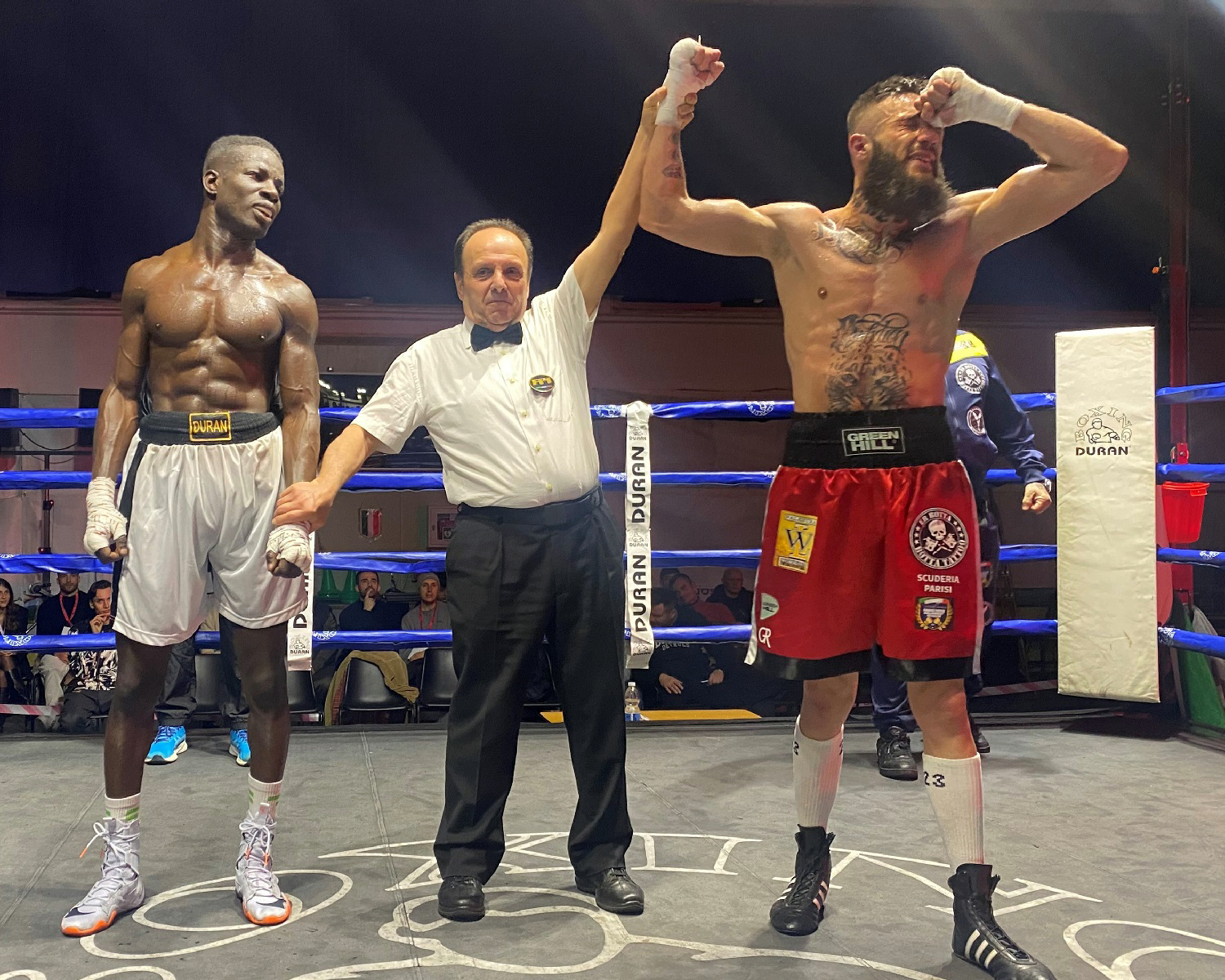 Le cose si sono complicate dal match di debutto al professionismo tra i Pesi Welter di Ali Marcel Valdevit; il pugile di Massimiliano Duran ha affrontato Cristian Sabbatini un avversario difficile perché autore di un pugilato aggressivo e imprevedibile, con già 3 match da pro all’attivo. Partenza un po’ in sordina di Valdevit, che ha boxato molto contratto durante le prime riprese, senza riuscire ad esprimenre il suo migliore pugilato e dando spazio all’avversario che avanzava portando colpi larghi e potenti e usando anche qualche scorrettezza, che tuttavia non veniva sanzionata dall’arbitro. Solo dopo la terza ripresa Valdevit ritrovava il ritmo giusto, riuscendo ad arginare al meglio le sfuriate dell’avvesario e boxando in modo lineare ed efficace come lui sa fare. Troppo poco però per i giudici, che al termine del combattimento hanno premiato il pugile romano per la maggiore continuità di azione ed aggressività. Il peso Welter di Duran, ha comunque rotto il ghiaccio e superata l’emozione del debutto, certamente avrà modo, grazie alla sua tecnica, di trovare future soddisfazioni anche nel pugilato professionistico.