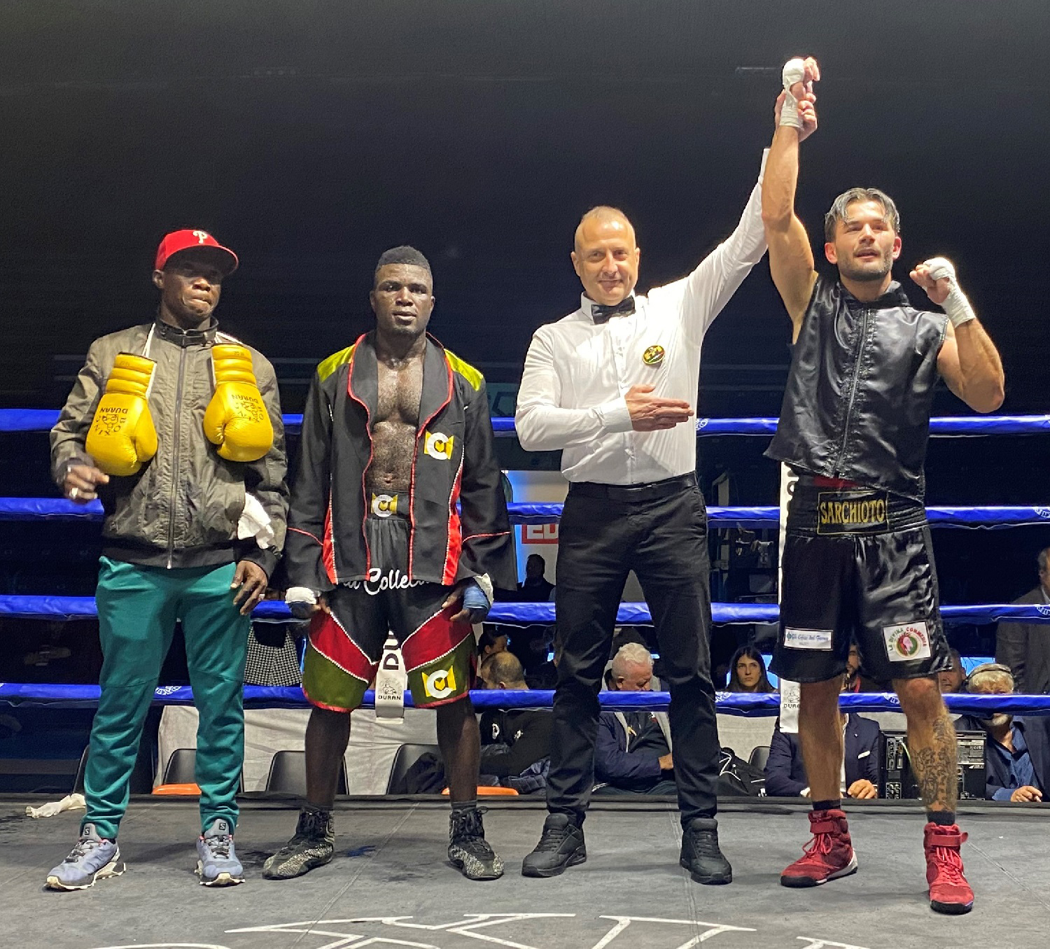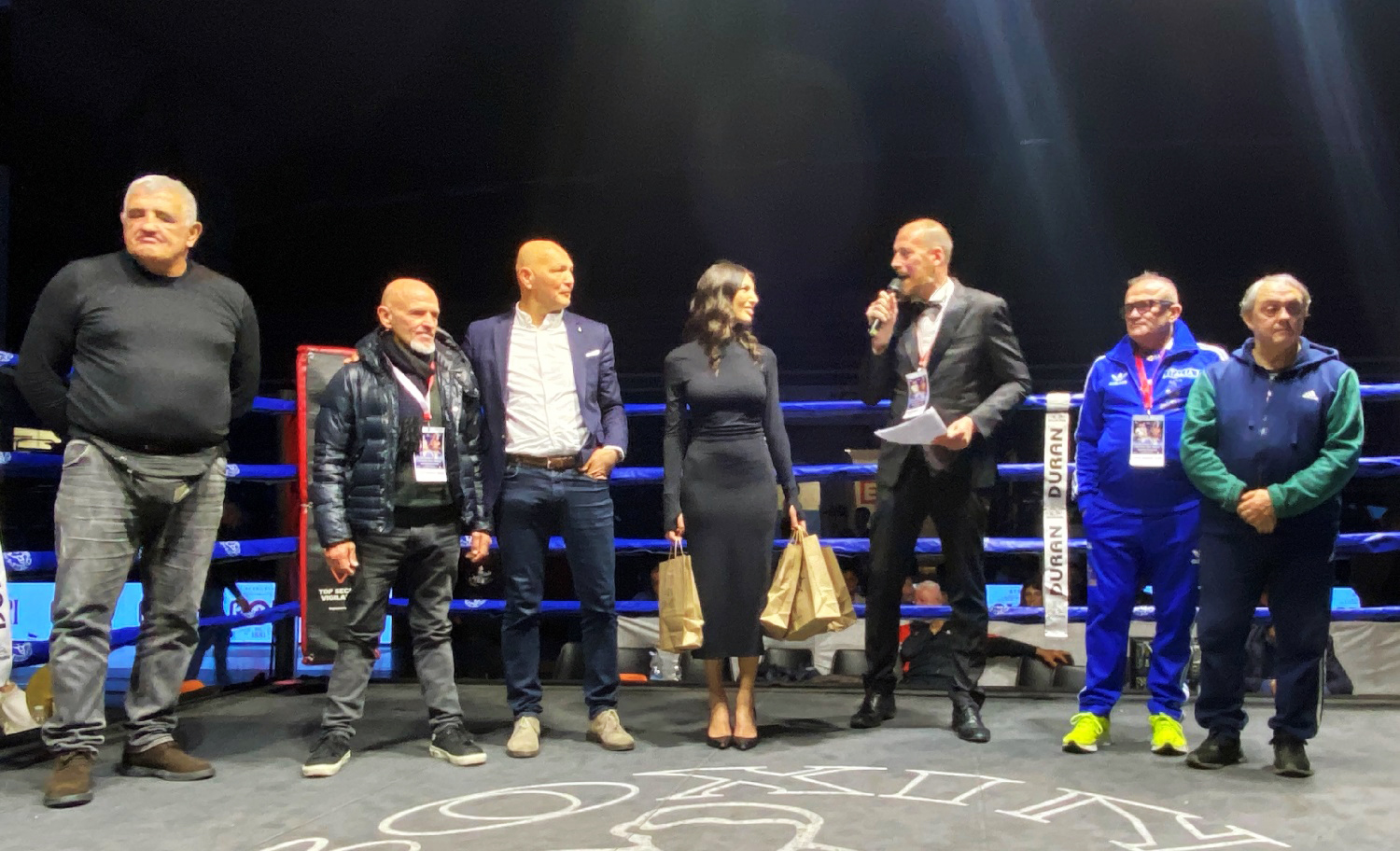 Sul quadrato a salutare il pubblico naturalmente anche i due campioni di casa, Massimiliano Duran, già Campione Mondiale W.B.A. dei Massimi Leggeri W.B.C. ed il fratello Alessandro già Campione Mondiale W.B.U. dei Pesi Welter e per la serata in veste anche di commentatore televisivo, con la figlia Carlotta presentatrice assieme al “Ring Announcer” Giorgio Ferroni.