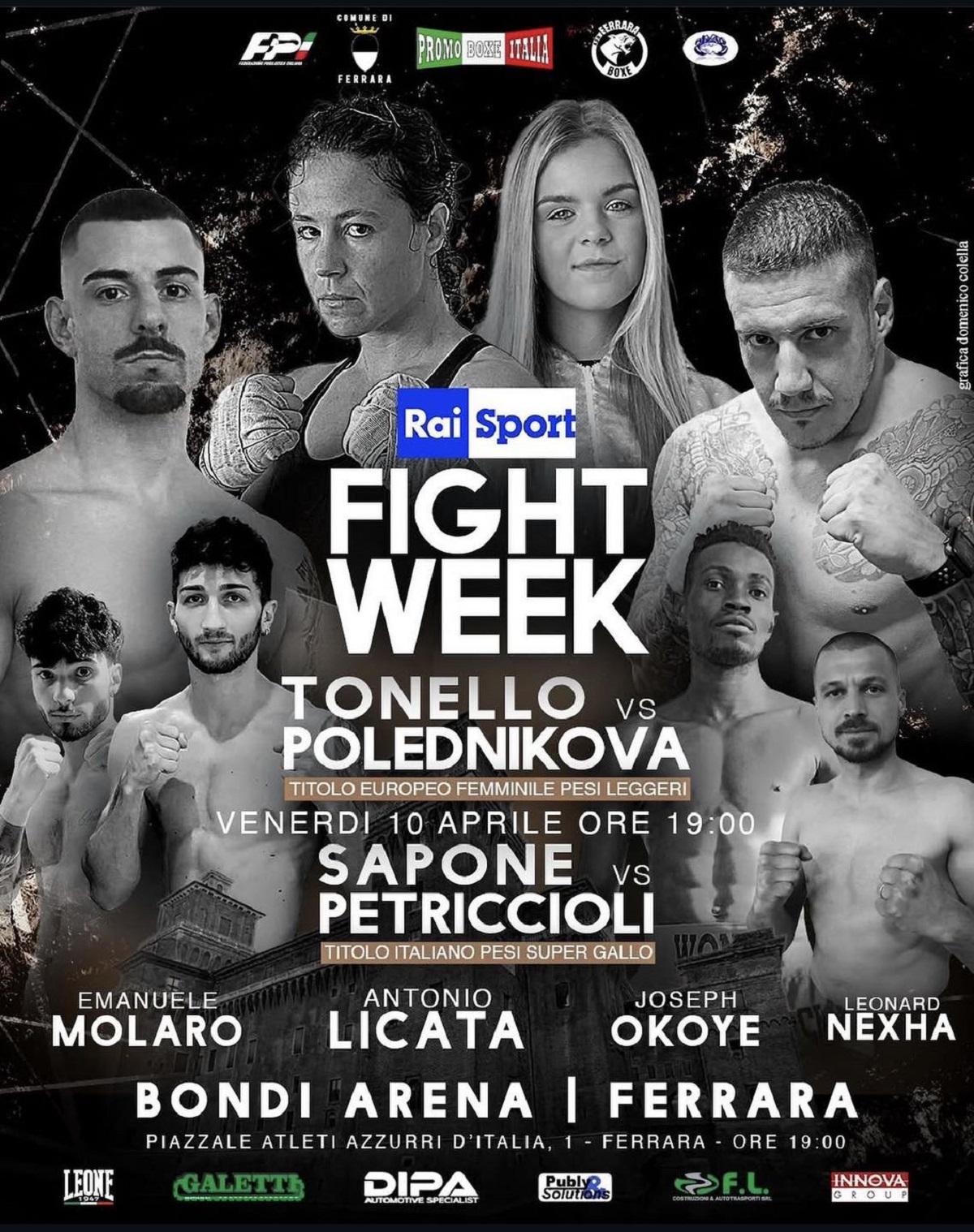 Oltre a Dario Sapone e Antonio Licata, venerdì 10 aprile sono previsti i combattimenti di altri tre pugili della Ferrara Boxe di Roberto Croce: il Peso Welter Emanuele Molaro, che affronterà il colombiano Camilo Caicedo;il Superleggero Joseph Okoye che affronterà il venezuelano Jose Luis Bellorin in 6 riprese e Hatia Hassen, che incontrerà nel match di apertura della serata, sulla distanza delle 4 riprese, il padovano Luca Targa nella categoria Pesi Super Welter.