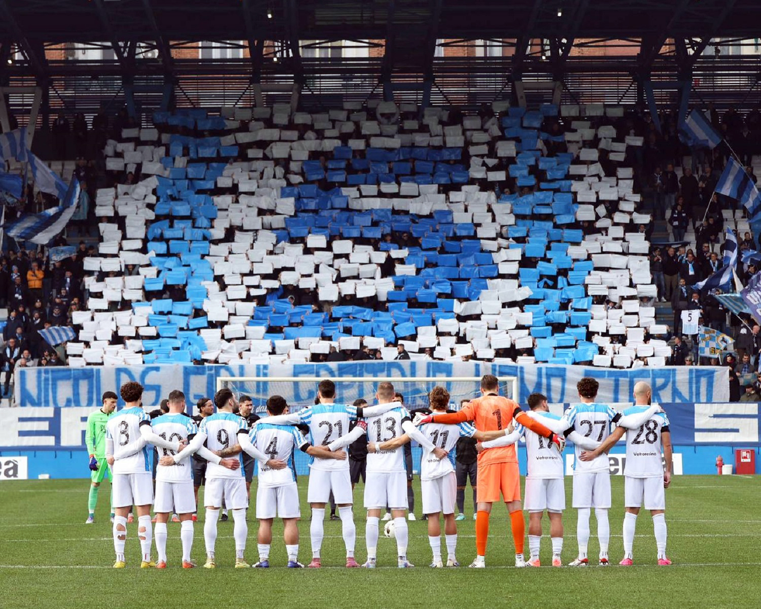 Durante il minuto di silenzio, sul cartellone led dello stadio, le immagini di Nicolas Giani festeggiare, in maglia Biancazzurra, i successi della Spal.