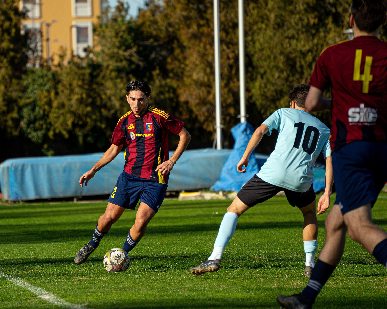 Nei primi venti minuti, entrambe le squadre cercano di prendere il comando delle operazioni senza creare pericoli davanti ai portieri e mostrando un sostanziale equilibrio. Poi, da un’azione insistita dei rossoblu nasce una buona opportunità per Pasqualino, ma il suo potente diagonale viene deviato da un difensore sopra la traversa.