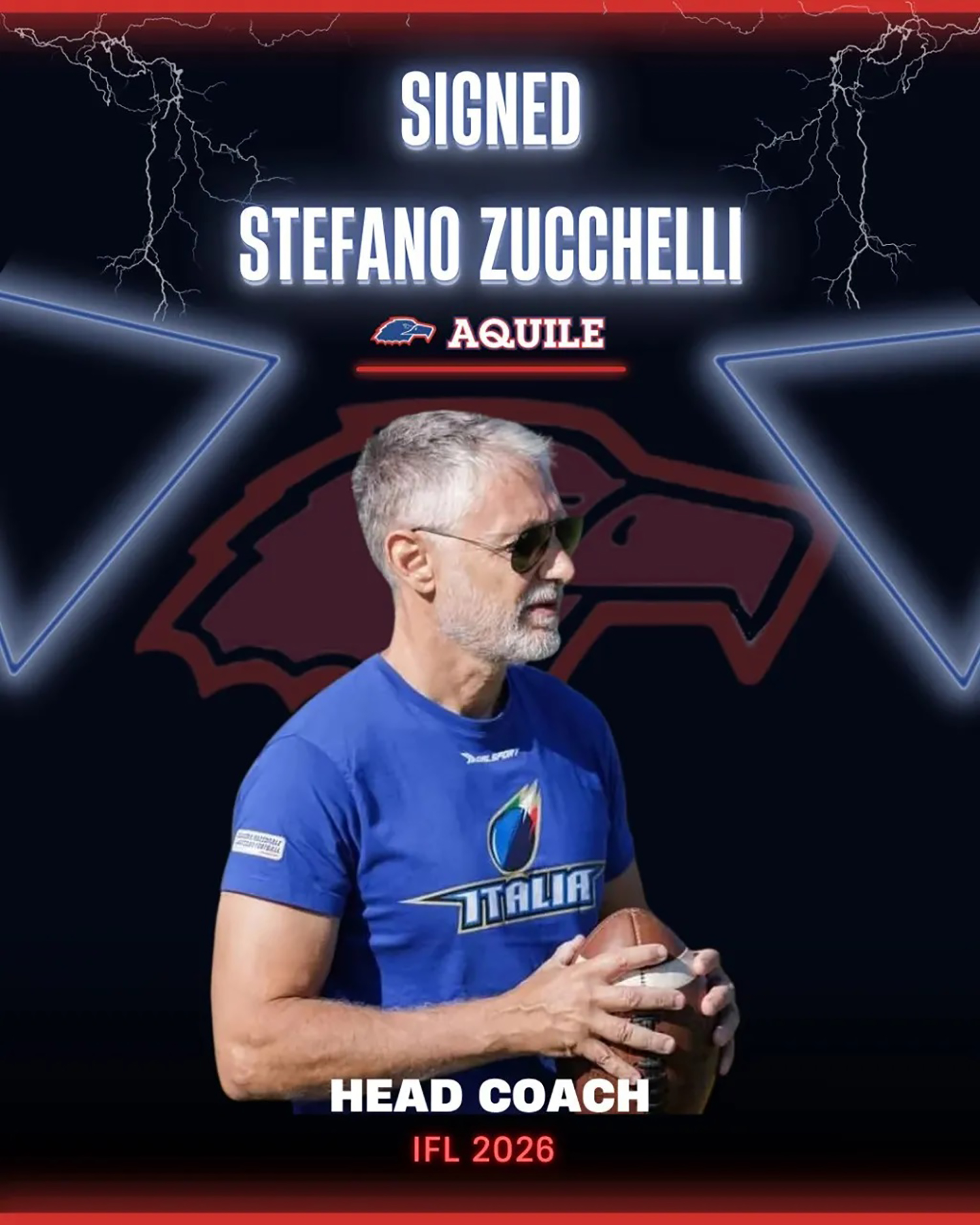 “L’Head Coach delle Aquile 2026 sarà Stefano Zucchelli. Inizia giovanissimo come giocatore nei primissimi Duchi nel 1981, per poi debuttare nelle Aquile nel 1983. Nel 1990 passa in sideline nello staff di Coach Wyatt. Impegni di lavoro lo allontanano quindi dal football per diversi anni, per poi rientrare nel 2014. “Specialista” del football giovanile, dove può vantare un tasso di vittorie superiore all’80%, è stato anche defensive coordinator e poi Head Coach delle Aquile in seconda divisione. Attualmente fa anche parte del coaching staff del Blue Team.