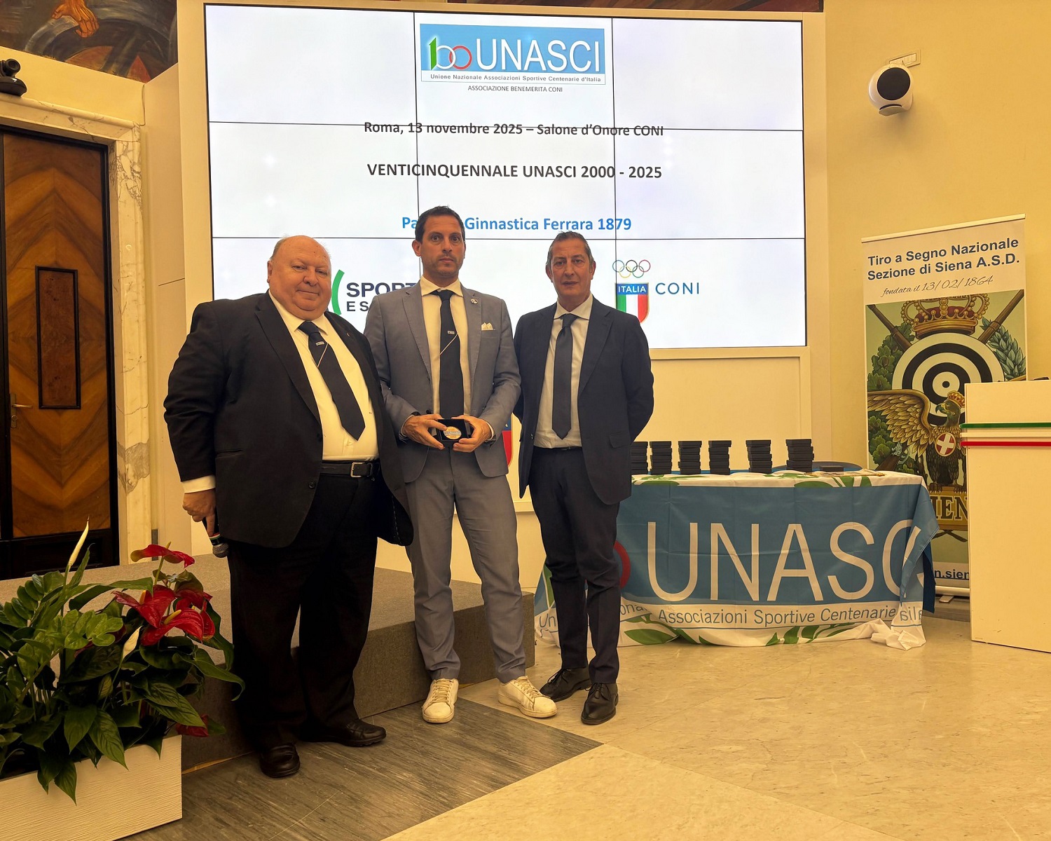 Tra le società storiche dell’UNASCI, anche Palestra Ginnastica Ferrara, che vanta quasi 150 anni di storia essendo stata fondata nel 1879, rappresentata dal Consigliere Mirko Rimessi, che ha ritirato il riconoscimento dal Presidente UNASCI Bruno Gozzelino e dal membro di Giunta CONI Francesco Ettorre, Presidente Nazionale di FederVela.