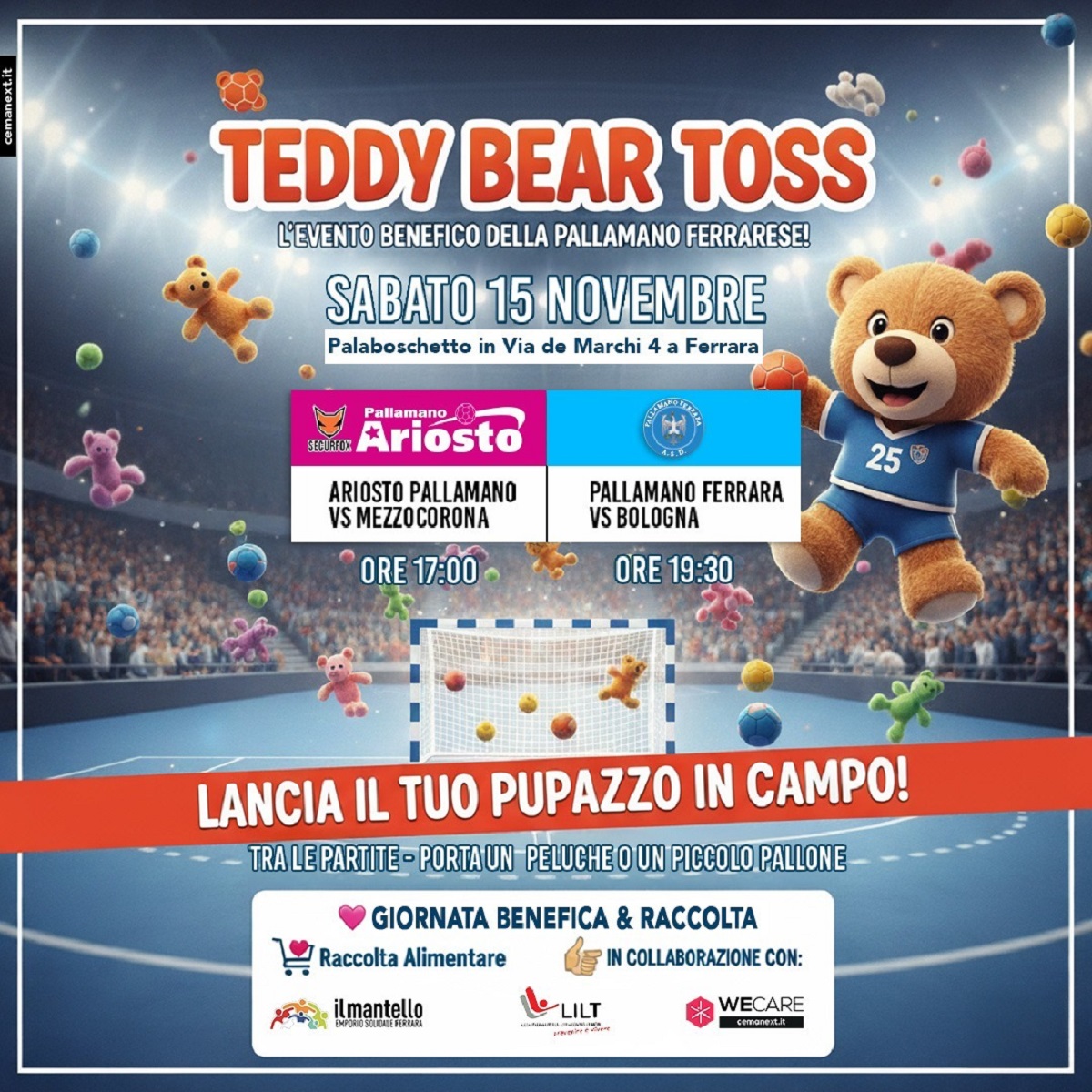 In occasione delle partite di Serie A1 Femminile: Pallamano Ariosto-Mezzo Corona e di Serie B Maschile: Pallamano Ferrara-Bologna United il pubblico potrà partecipare al “Teddy Bear Toss”, un evento benefico che prevede il lancio in campo, quando richiesto, di peluche e palloni, mentre altri giochi in buone condizioni, potranno essere consegnati ai volontari delle associazioni presenti.