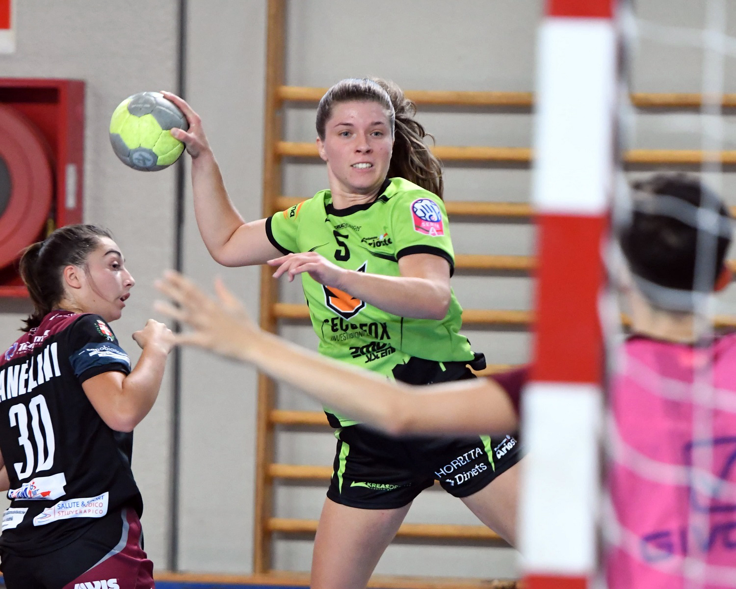 La partita era iniziata con un immediato tentativo di fuga, delle abruzzesi, tuttavia Soglietti e compagne, riescono a riorganizzare velocemente la fase difensiva, e ricuciono l’immediato svantaggio riportandosi rapidamente in partita, grazie al contributo realizzativo, di tutte le atlete schierate in campo. La danese Schonherr arrivata alla vigilia della precedente giornata a di campionato, dirige con ordine in cabina di regia, consentendo alle esterne Soglietti e Chiara Ferrara di colpire con precisione dalle fasce laterali.