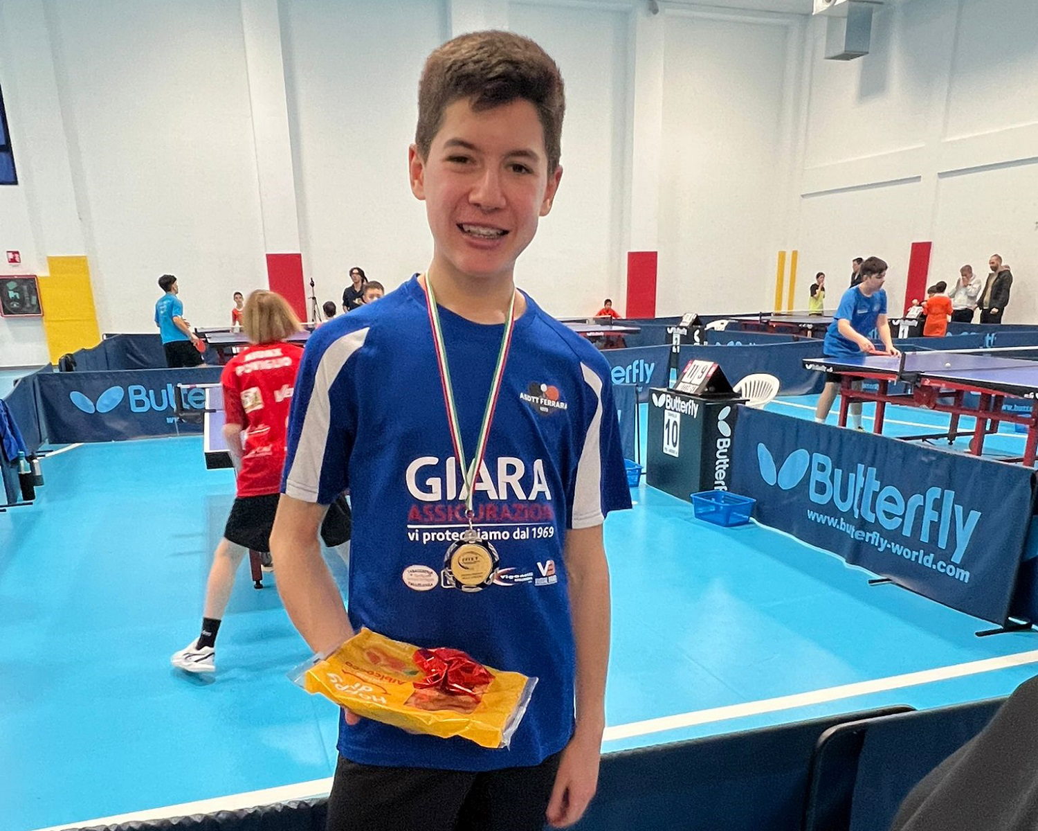 La Giara Assicurazioni Tennistavolo festeggia il grande risultato di Pietro Andreoli, (foto sopra) che nei campionati italiani di terza categoria, disputati a Terni la scorsa settimana, ha chiuso la sua corsa nei primi otto, sfiorando il podio in un tabellone di circa duecento iscritti ed estremamente qualificato. L’under 15 ferrarese, sempre più al comando della classifica italiana della sua categoria di età e ormai ampiamente fra i primi ottanta giocatori italiani di quella assoluta (miglior ranking di sempre per un giocatore della nostra provincia in ambito nazionale), ha vinto a punteggio pieno e senza particolari problemi il suo girone (successi su Russo, Pasolini e Neri), per poi imporsi nella fase a eliminazione, nell’ordine, su Rossetti (3-2), Giustiniani (3-1) e Scucchiaro (3-1), prima di cedere in quattro set al fortissimo veterano Adeyemo, poi finalista.
